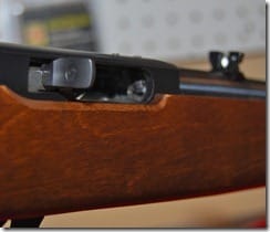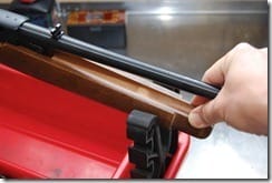 | Gently lift up on the front of the barrel, making sure that the safety button is positioned in the middle – halfway between on and off. Be careful with this step as the safety can catch on the inside of the wood stock if it’s not centered. Also, there is a notch on the back of the receiver so be sure to remove the barrel end first. We want to keep this nice little stock for future use after all. | |