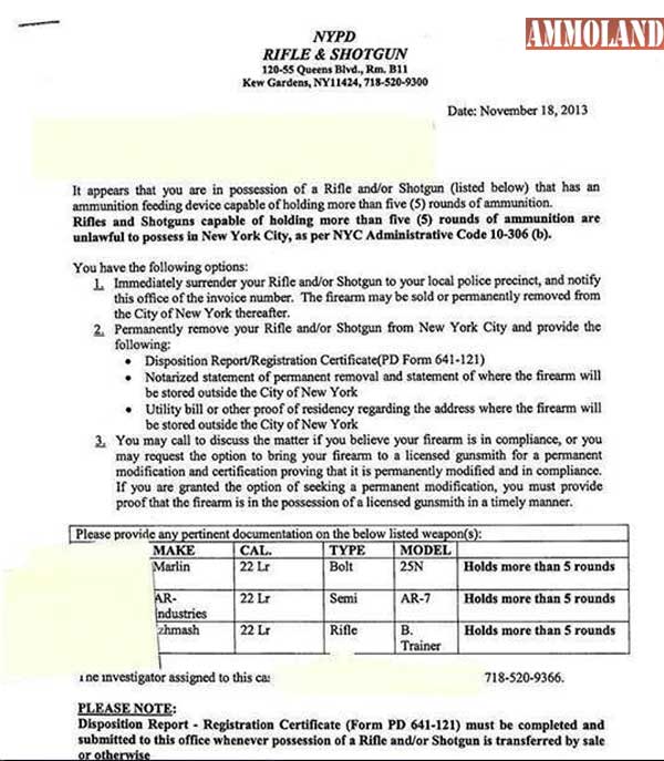 BELLEVUE, WA –-(Ammoland.com)- According to multiple reports, residents of New York City have started receiving letters demanding they must surrender their rifles and/or shotguns to the authorities. According to NYC Administrative Code 10-306-(b) it is illegal to possess a rifle or shotgun that can hold more than five rounds.