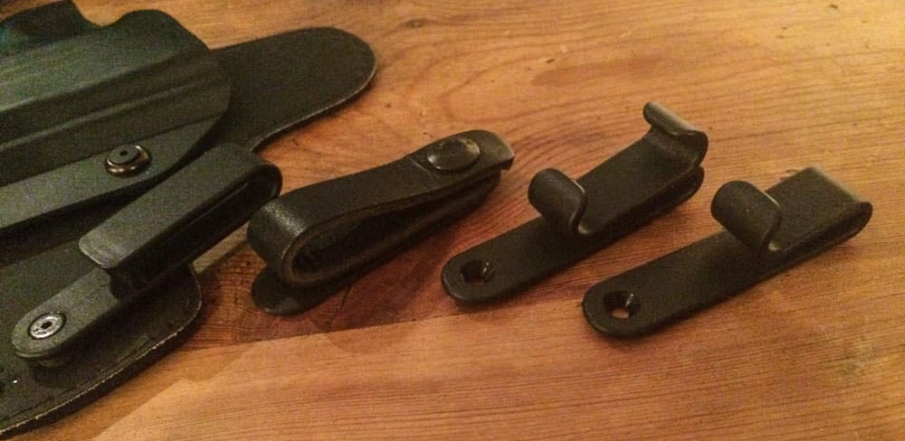 The Alien Gear IWB holster comes with standard Kydex clips that loop over the top of the belt and catch the bottom of the belt. They’re tuckable and very secure, but you will see the front section of the clip lying on top of the belt.
