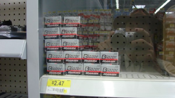 On September 30th 2015, in a Dallas WalMart near the North boundary, off of Marsh Lane, I spotted these boxes of Blazer .22 Long Rifle, at $2.47 for a box of 50. That is less than 5 cents a round, starting to approach pre-bubble levels.