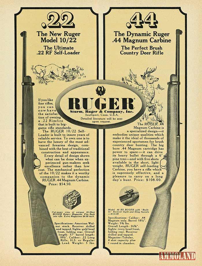 Way back in 1964, Ruger released this gun, and from a quick look at the exterior, it appears almost identical to the current 10/22 Carbine model. Back then, it seems Bill Ruger considered this a little brother companion gun to the Ruger .44 Magnum Carbine, which Ruger billed as “The Perfect Brush Country Deer Rifle.” In fact, if you look at the original ads for the 10/22, Ruger describes it like this: