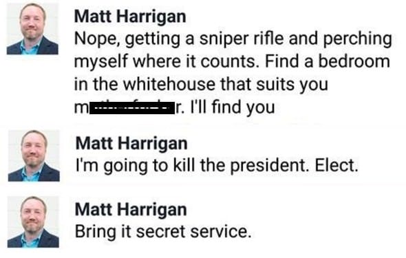 “I’m going to kill the President. Elect,” Harrigan doubled down. “Bring it secret service.”