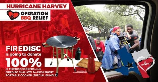 To help with the massive clean-up and rebuilding efforts needed, FireDisc will donate 100% of the proceeds of sales of the FireDisc Shallow 24” Short Portable Cooker (Special Bundle) www.firedisccookers.com/harvey-relief/ from this Friday, September 1st, through Monday, September 4th to Operation BBQ Relief operationbbqrelief.org/ . O