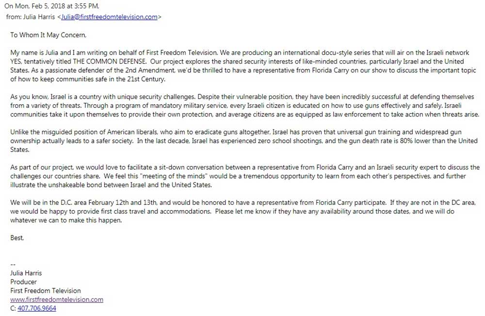 It started when Virginia Citizens Defense League received an email last week from a company called “First Freedom Television” to do an interview with an “Israeli security expert” on the “shared security interests of like-minded countries, such as the U.S. and Israel.” [note according to whois.org and web.archive.org their website https://www.firstfreedomtelevision.com/ was registered on 01/10/2018 for one year only and appeared online around February 13th 2018]