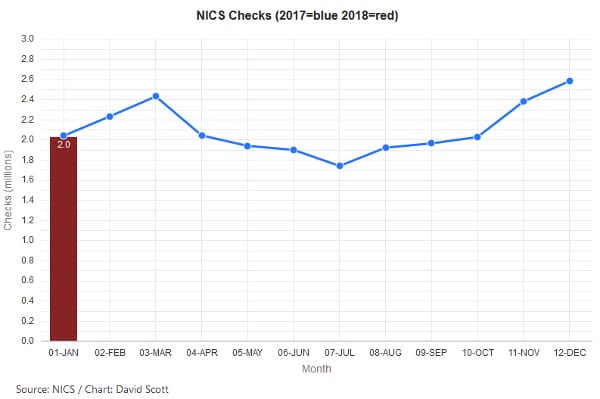 January has a traditional fall-off in sales compared to the record-breaking month of December, with Christmas in full swing. The month of January in 2013 and 2016 were higher than January, 2018, but both of those years were marked by significant concerns that politicians would ignore the “shall not be infringed” words in the Second Amendment, and implement stringent restrictions on purchasing, owning, and using firearms.