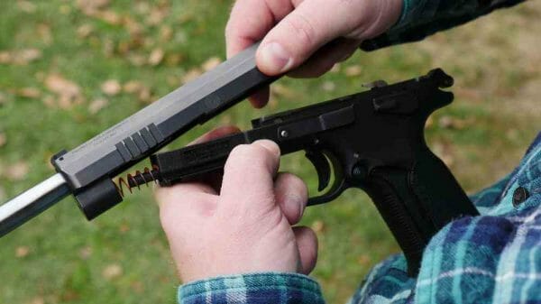 There are a couple of other cons that I feel hold the pistol back, one being the obvious lack of parts and aftermarket support. Should the pistols ever become popular that would be a self-correcting issue I feel. The other glaring issue with the pistol is the method of takedown. It darn near requires three hands and more coordination than I have on most days. There is a small takedown lever that you pull down as the slide is drawn to the rear and lifted off the frame and then the slide has to be taken off to the front of the gun due to the guide rod attached to the frame.