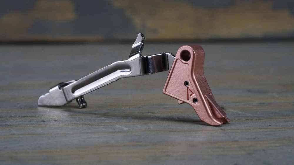 The Agency Liberty Trigger is machined from C145 Tellurium, a copper alloy, and is based on Agency’s highly successful Drop-In Flat Faced trigger. The Liberty Trigger is mated to a highly polished OEM-Glock-trigger bar and is held in place with the same coiled spring pins used on their regular trigger.