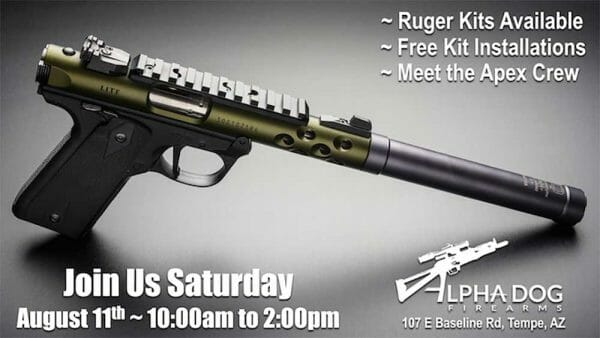 For those in the southeast valley area of Phoenix, Alpha Dog Firearms is located at 107 E Baseline Road in Tempe. This event is open to the public and Apex staff will be on-hand to answer questions and help customers pick the right kit for their pistols, including the new Action Enhancement Kits for the Ruger Mk IV pistols.