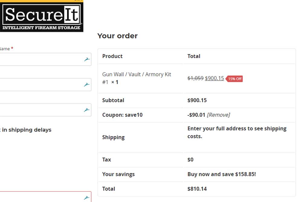 USA – -(Ammoland.com)- Buy Online Two OrangeSecureIt Firearms Storage systems has their SecureIt Gun Wall Vault Armory Kit #1 on sale that with coupon code “save10” you can get the system for $810.14. That is a savings of $328.37 off the retail price.  Not what you need? FYI; the coupon code works on all their products.