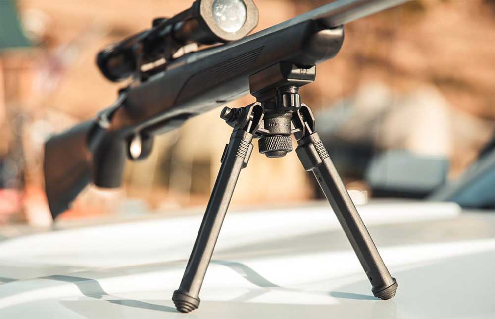 Providing the same premium features available in the existing line of Magpul bipods, the Sling Stud QD bipod brings you the high performance associated with higher-priced bipods at a significantly more affordable price. Spring-tensioned, Mil-Spec hard anodized 6061-T6 aluminum and injection-molded, reinforced polymer legs stow neatly forward and snap down and lock into place with one hand. Leg extensions slide and lock securely with the push of a button on any of the seven locking detents extending from 6.6” to 10.0”. An industry-exclusive 50° of total tilt are controlled by a glove-friendly, knurled, tool-less, bipod locking knob located between the extended legs, allowing easy adjustment between shots. A soft rubber bipod locking knob cap is attached to the locking knob, giving users a steady, non-marring forward rest while the bipod is folded. Additionally, its staggered soft rubber feet hold fast on a variety of shooting surfaces and are easily removed with a roll pin punch. Should users choose to change feet, the Sling Stud QD’s legs accept most Atlas-pattern bipod replaceable feet. The streamlined housing and legs fit neatly under the barrel and are just under 2.5” deep and 3.3” wide when folded.