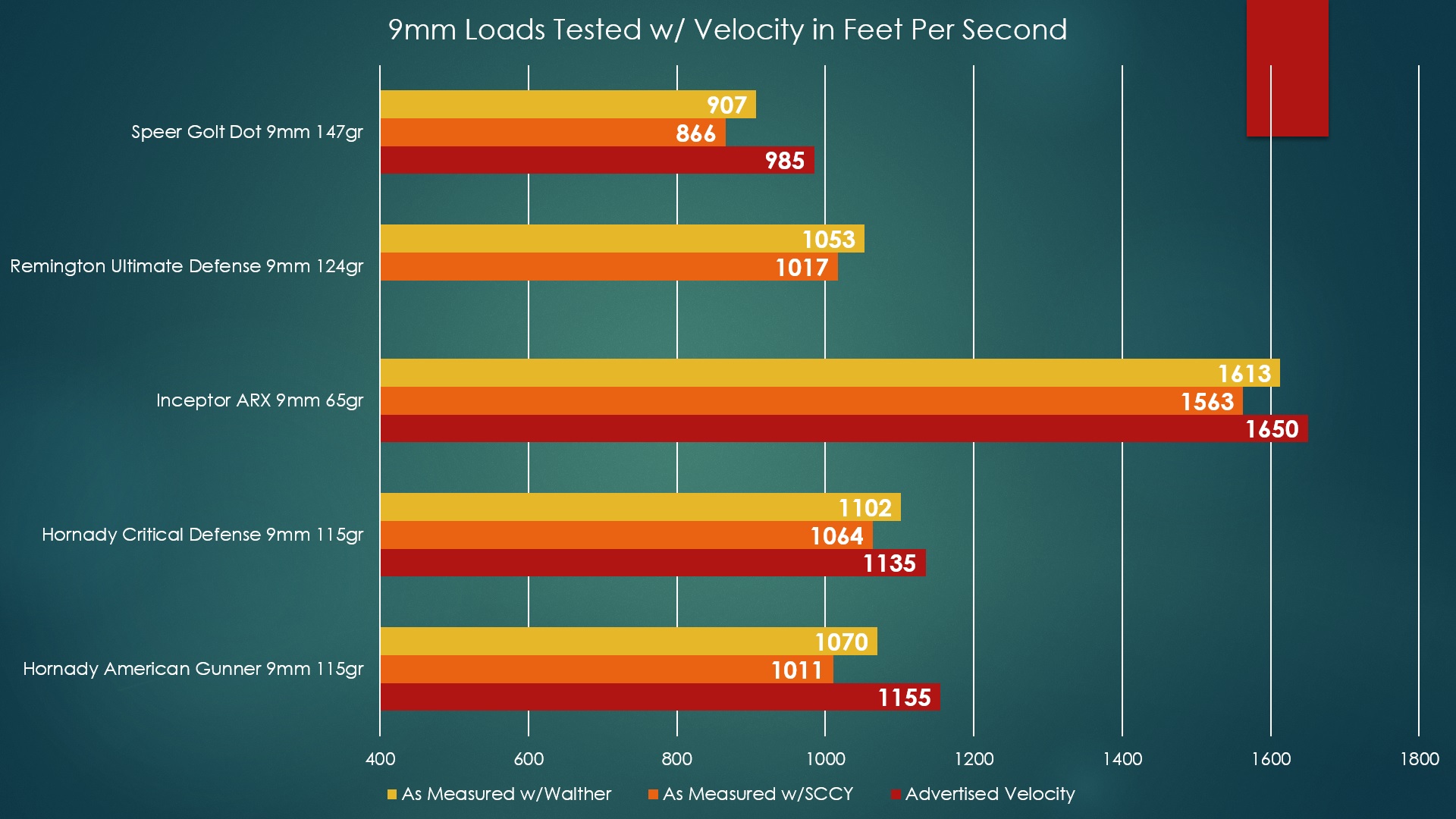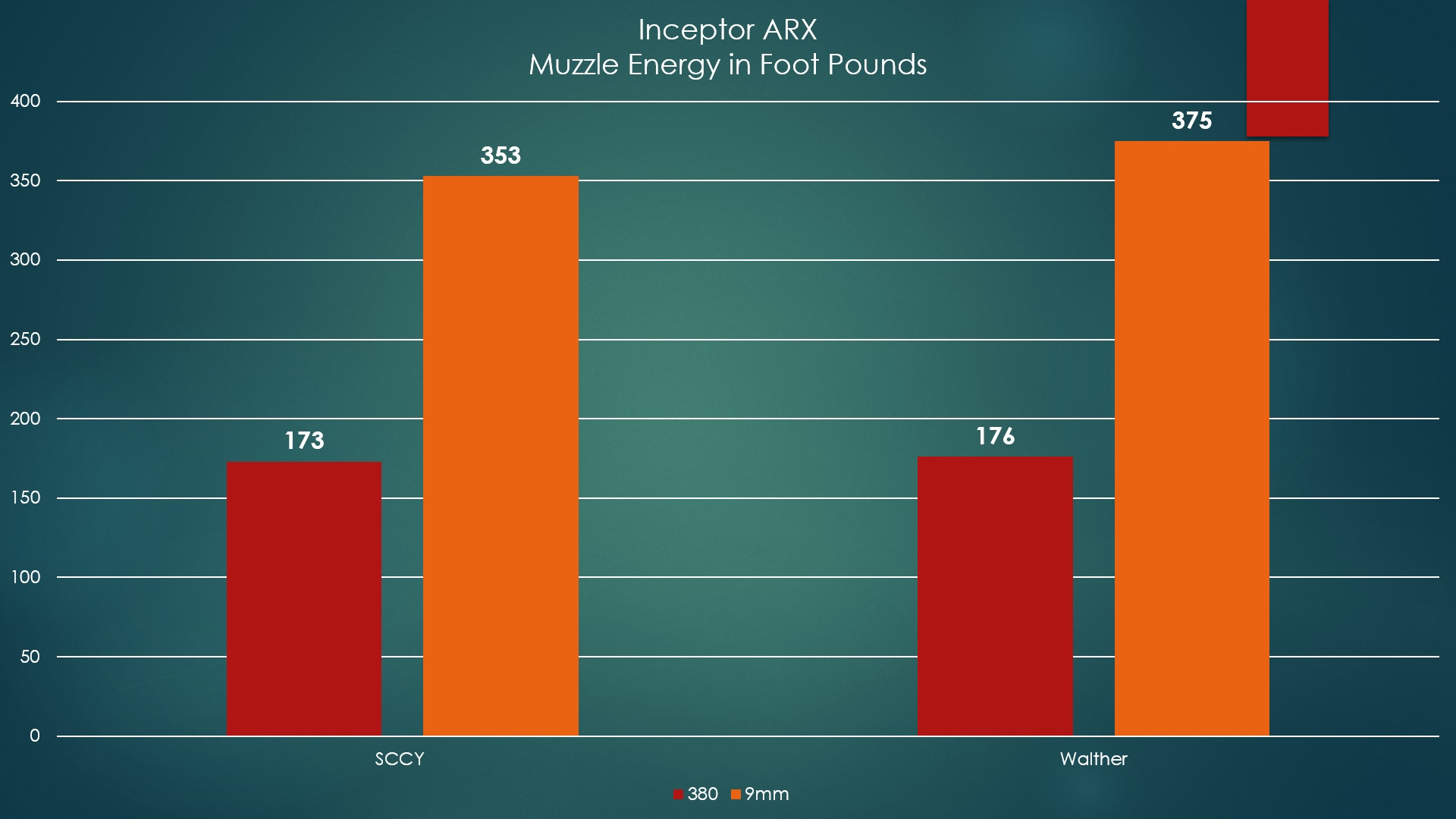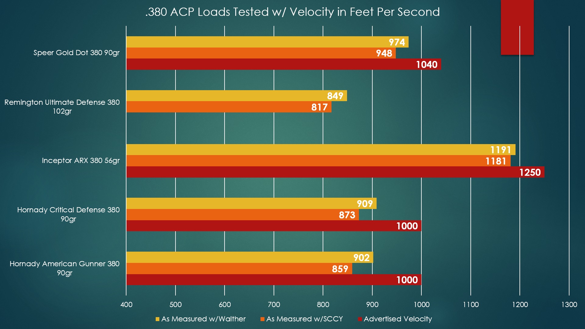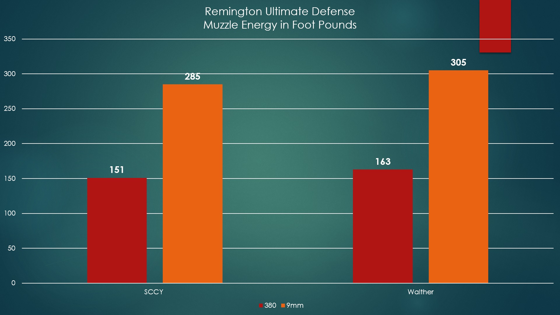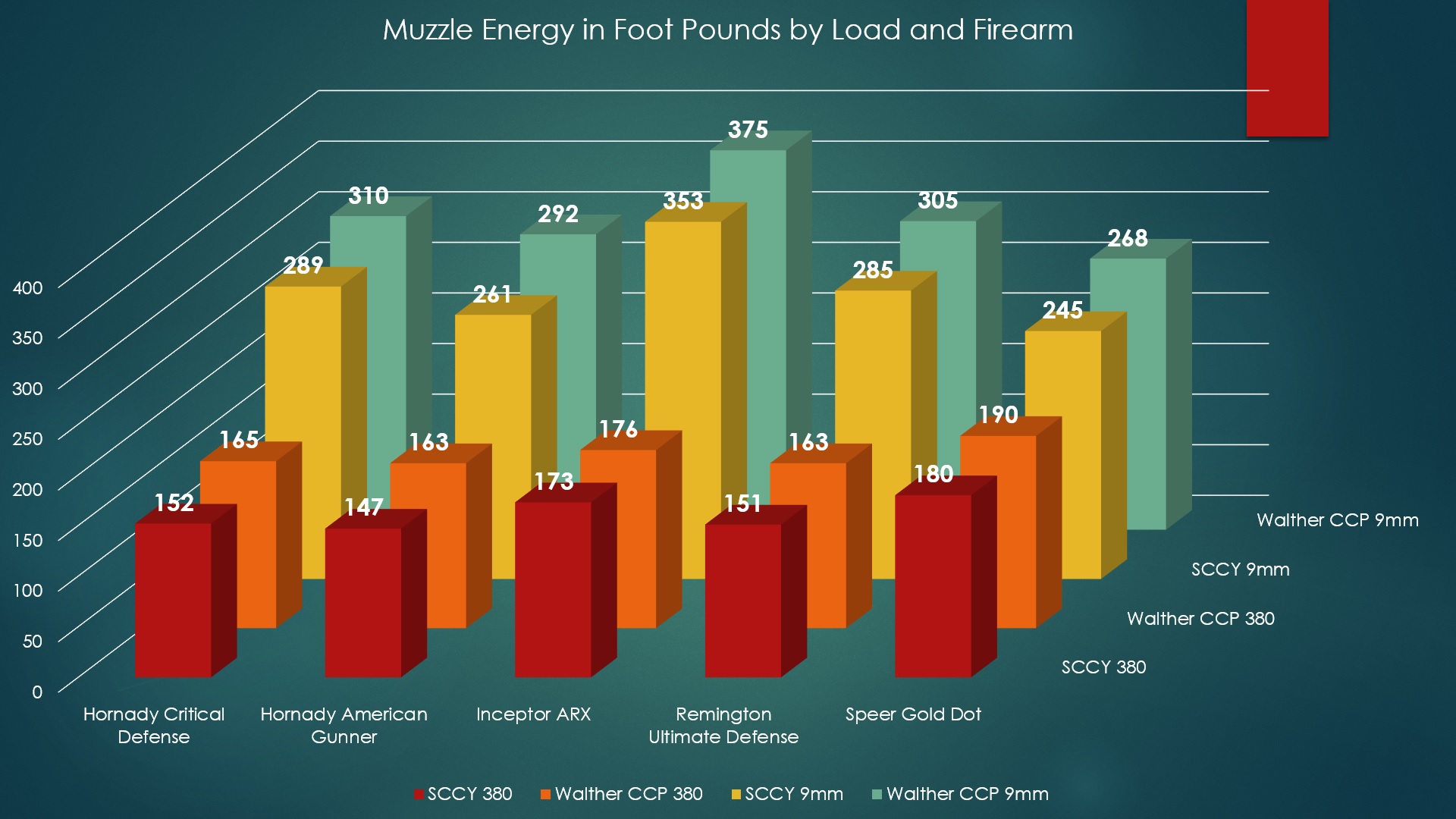 The energy difference in 9mm v. 380 ACP, in general, is considerable. What could not be measured is the real-world terminal performance of these rounds (no volunteers were found). Variables of their effectiveness would include shot placement and the target’s mental and physical resistance to wounds sustained. For ammunition, the largest variable that keeps this argument alive for some will come from the combination of powder burn rate and barrel length as it certainly can make a difference. Finding those pairings, however, would more likely be an exception than the rule. We also discovered that it seems ammunition manufacturers either can’t or haven’t loaded Browning’s baby, .45 ACP, to take advantage of longer barrels the way 9mm can. In most tests, I’ve seen 9mm doesn’t top out on speed until somewhere around the 10″ barrel length. That being said the SCCY’s 3.1″ and Walther’s 3.54″ barrels aren’t exceptionally long, but our data seems to indicate that the loads tested weren’t going to get much more out of anything longer than 3″.