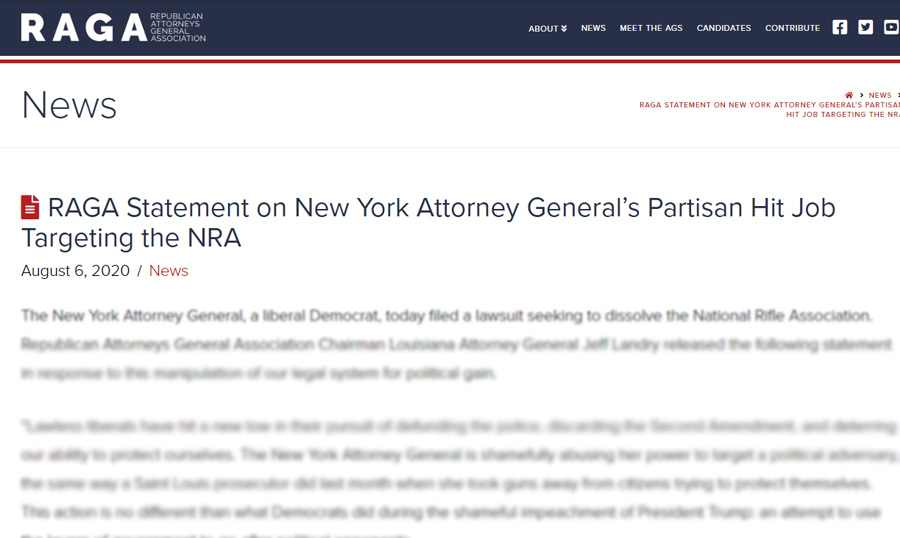 U.S.A. -(AmmoLand.com)- August 6th, 2020 – The New York Attorney General, a liberal Democrat, today filed a lawsuit seeking to dissolve the National Rifle Association. Republican Attorneys General Association Chairman Louisiana Attorney General Jeff Landry released the following statement in response to this manipulation of our legal system for political gain.