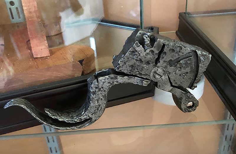 At this same site, Persinger found several shoulder scales, artillerist tools, and a Burnside block — an invention that chambered a .54 caliber bullet, which had an effective range of 200 yards. Further searching uncovered a cache of 621 bullets hidden on top of a rock and covered with debris. Finally, a complete multi-loaded Austrian Lorenz .54 caliber musket (minus the wooden stock) made his Minelab machine sing out.
