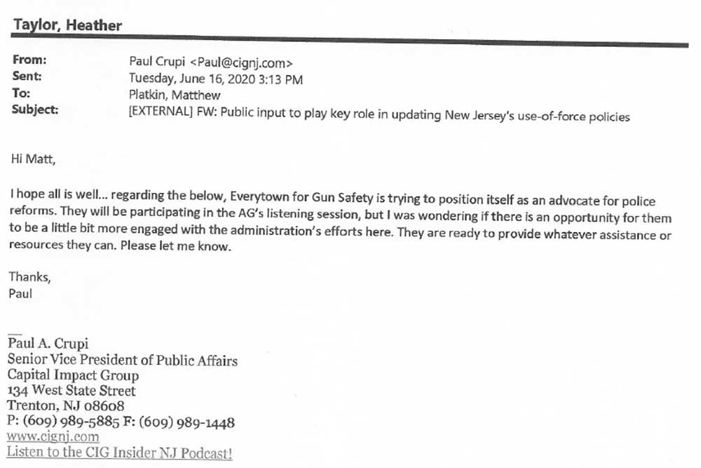 “Gov. Murphy talking about being ready to challenge CCR (concealed carry reciprocity) in court if it passes. That would be an NJ AG effort. Could we set up a conversation with the NJ AG to discuss this?”