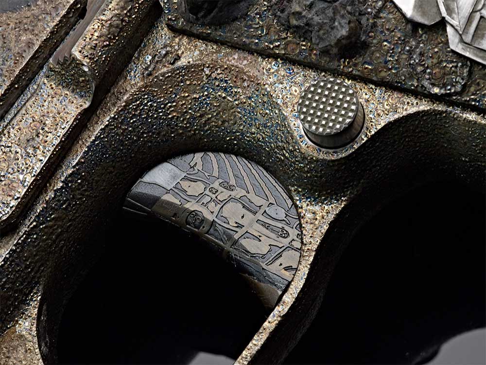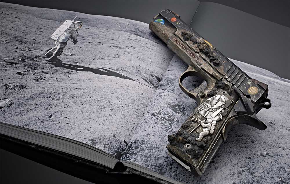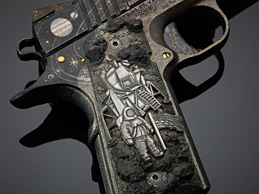 The space-black slide provides the perfect backdrop for planetary orbits, shooting stars, and meteorites, rendered by FEGA Master Engraver Lee Griffiths’ expert touch. The astronauts and Apollo lunar module featured on the grips were cut out of steel plates, sculpted, and then carefully welded into place. “From an engraver’s perspective it was an absolutely delightful mind-bending challenge to unite heaven and earth. The creation process was a personal and unique way to experience a moon landing vicariously,” says Griffiths.