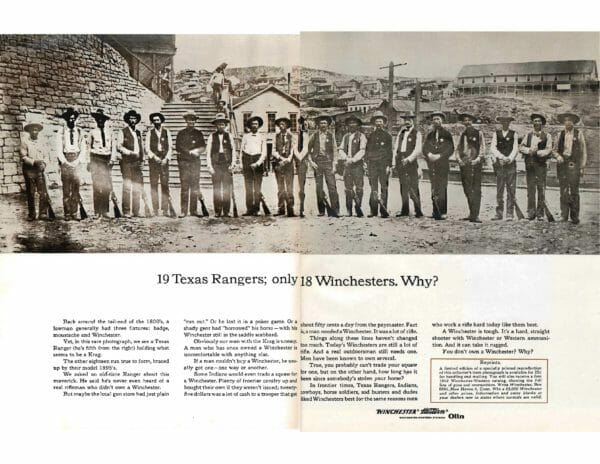 In 1962, Winchester created an exact duplicate of serial number 2,500,000, except this time the serial number was 2,500,000A. They decided to hold a contest for this gun, calling it the “Win-A-Winchester” contest, and they started off with their 1962 catalog that had an image of 19 men all standing armed with Winchester Model 1895 lever-action rifles – all except one man. He’s got an older Krag model rifle, and Winchester decided that they were going to craft a story around this and they wanted to bring the public in on it for the contest. Entrants were to give their best explanation as to why this one man was not carrying a Winchester.