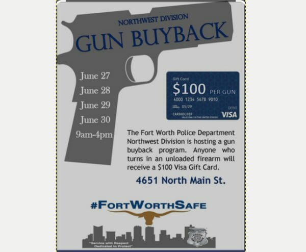 The event called by the Orwellian term “buy back” (police cannot “buy back” items that they have never owned), is scheduled to be held at the Northwest Division. The address is 4651 N Main St Fort Worth, TX 76106.