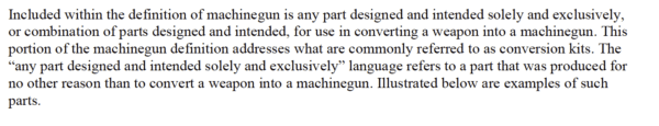The manual reads: “Included within the definition of machinegun is any part designed and intended solely and exclusively, or combination of parts designed and intended, for use in converting a weapon into a machinegun. This portion of the machinegun definition addresses what are commonly referred to as conversion kits. The “any part designed and intended solely and exclusively” language refers to a part that was produced for no other reason than to convert a weapon into a machinegun. Illustrated below are examples of such parts.”