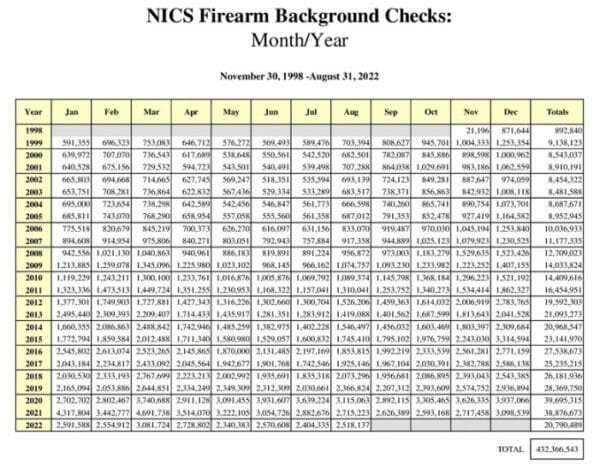 The National Shooting Sports Foundation makes an “adjustment” of the data each month to more closely reflect the estimated number of actual gun sales. Where the August raw figure of 2,518,137 NICS checks were initiated, according to the FBI chart, the NSSF-adjusted figure for gun-related checks was 1,286,816, which is still a lot of gun sales.