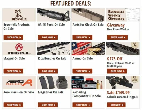 Customers can click different images on the Deals site to get instant access to Featured Deals on Brownells house products, AR-15 parts, and items from Magpul, Aero Precision, and other popular manufacturers.