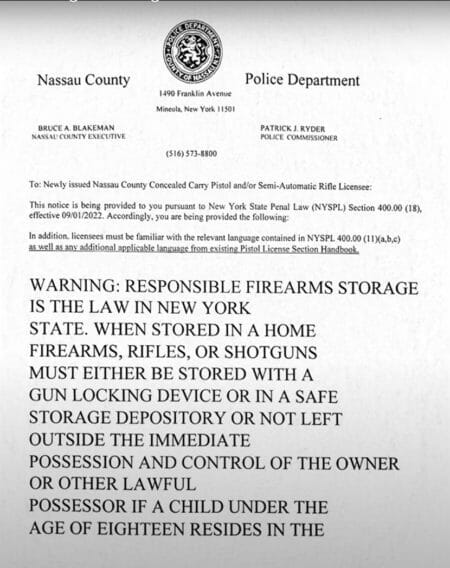USA – -(AmmoLand.com)- Apparently, New York State is not very happy with the fact that the court system keeps shooting down their unconstitutional gun laws. So, the anti-gun Empire State has decided in Nassau County to send out letters to new concealed carry permit holders reminding them of the firearm storage laws within the state and demanding that they abide by them.