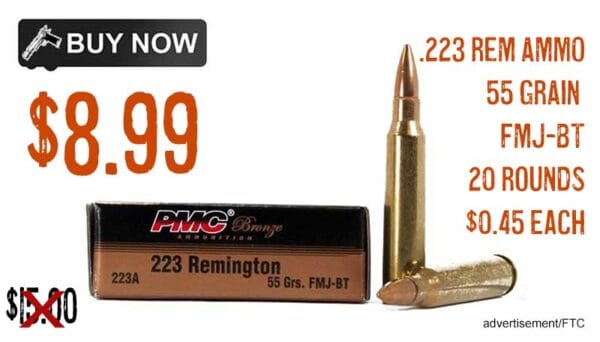 Palmetto State Armory has a low price on 20-round boxes of PMC Bronze 223 55GR FMJ Ammunition for $8.99 a box. That is $0.45 for each round.