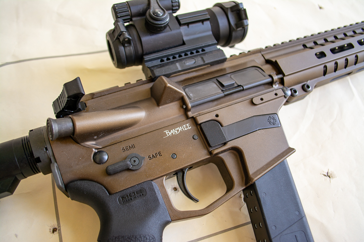 Like other Banshees, you’ll notice that it looks like an AR. It is, at least on the surface. The new Mk10 10mm uses a custom lower receiver so important things like the magazine well are machined specifically for Glock-compatible magazines. Oh, that lower has a flared and beveled magazine well custom fit for the 10mm magazines. Controls are where you would expect on a standard AR-type pistol. The magazine release looks a little different, but you still press your finger in the same place to drop it. I think it’s actually better as the “button” is larger and easier to operate with your trigger finger.