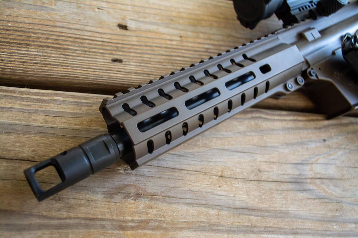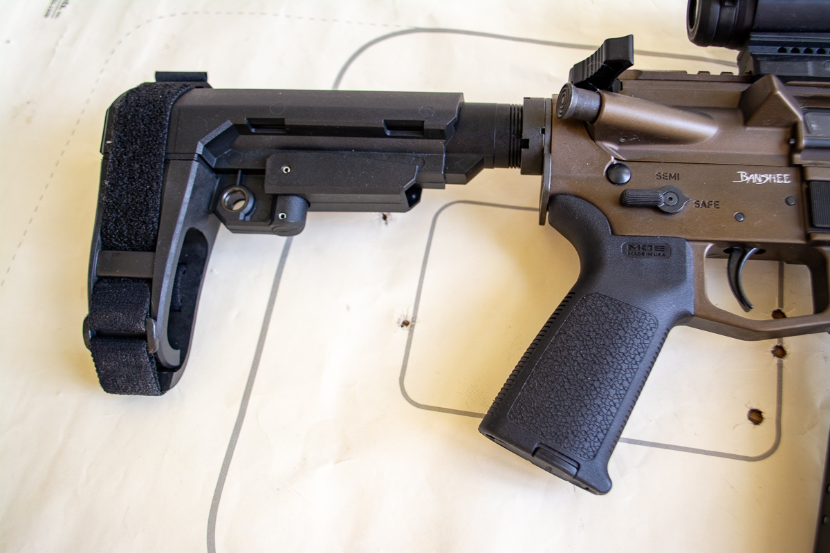 The Banshee Mk10 features an eight-inch barrel with a 1:16-inch twist rate. It’s tipped with a muzzle brake, generous side ports, and two gas outlets directly on top to help discourage muzzle flip.