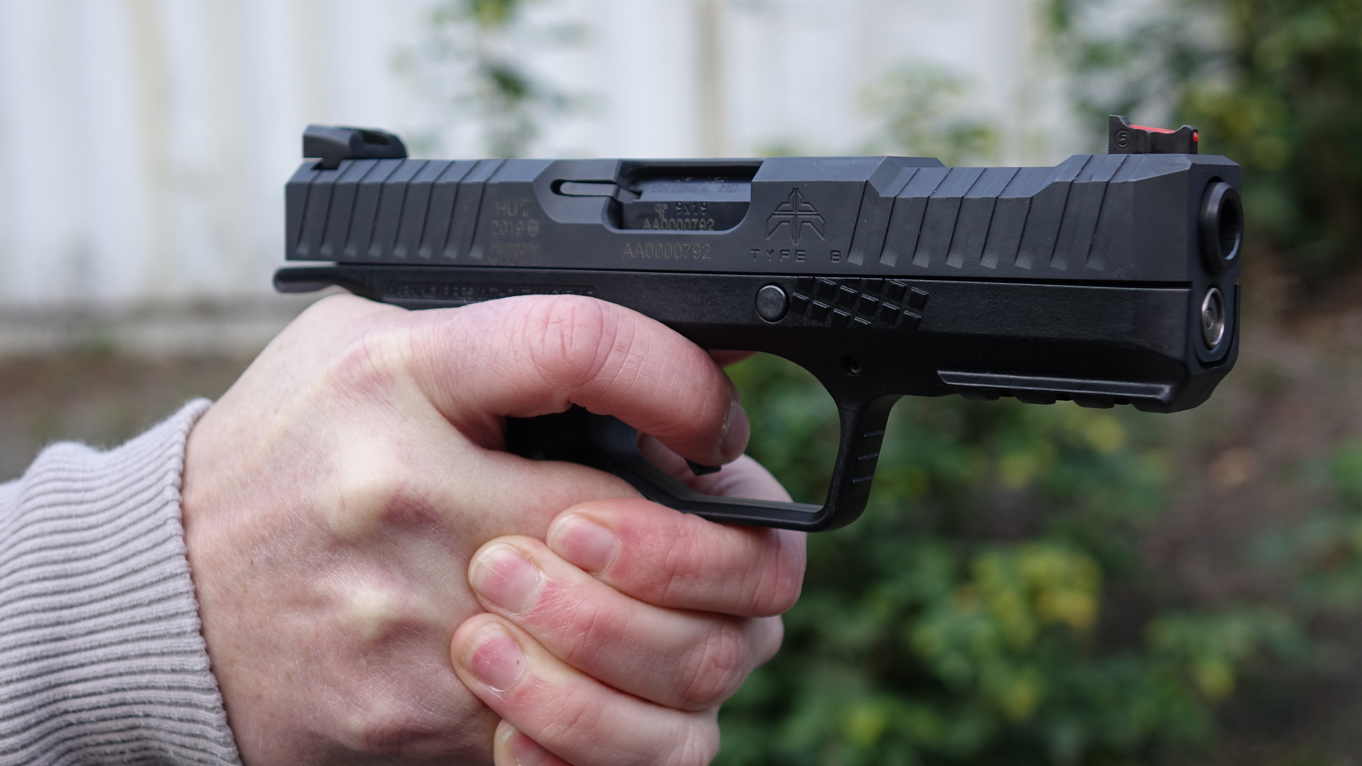 That model was known as the “Stryzh” and was the combined brainchild of Italian and Russian design. As much as I loathe claims of low bore axis, the pistol appeared to sit very low in the hand. In fact, it does; more on that later. In 2016, Arsenal Firearms showed a “Stryk” pistol of similar design that would be manufactured in the US in partnership with Salient Arms International. Those guns blipped on the market and then disappeared. There is so much, in fact, that there isn’t a trace of them on Salient’s website. Today, we have the Archon Type B; the sample shown here contains parts from at least three different countries: Germany, Hungary, and the United States. Adding further mystery to our Archon Type B is that the frame is stamped “Made in Germany” and slide “Made in Hungary,” yet earlier samples seen in the hands of media have the opposite.