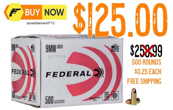 Bereli has Federal Training 9mm 115gr FMJ Ammunition, 500 rounds, marked down to $125.00 a box with free shipping —that is 51% off the MSRP!