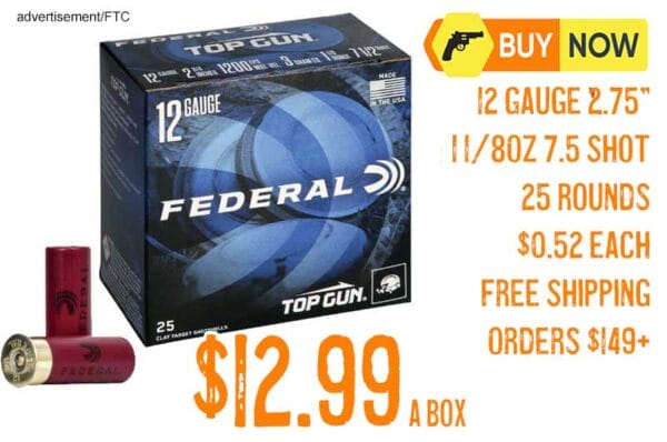 Federal Premium has a great factory direct deal on Federal Premium Top Gun 2.75″ 1 1/8 Oz 7.5 Shot 12 Gauge shotshells $12.99 a box. Free shipping if you buy 12 or more boxes or on orders over $149.00, with an 80-box purchase limit.