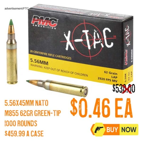 The Mag Shack has 1000 rounds cases of PMC X-TAC 5.56 NATO M855 62gr Green-Tip Ammo marked down to $459.99—that is $0.46 a round and 13% off the MSRP! You save $70.00+ with Fast shipping!