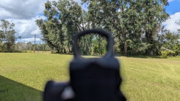 It’s a clear view that’s quite nice and crisp. The dot still appears nice and bright. In fact, it gets insanely bright. In Florida, in the middle of the day, I don’t need to use the brightest setting. I shoot against a mostly white berm, and it’s still easy to see and extremely visible.