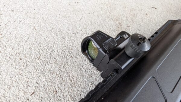 Budget optics typically use budget emitters, and to make your dot bright enough to see, you have a fairly dark lens coating. This is a notch filter that reflects the light from your emitter. That’s not the problem here. The notch filter isn’t super dark and not distracting. It’s light, and in bright daylight, I can’t even see the notch filter.