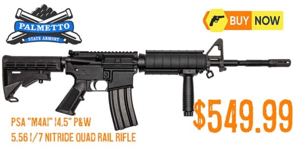 The PSA “M4A1” 14.5″ P&W 5.56 nitride quad-rail rifle is currently listed at $549.99 at Palmetto State Armory — a great price for a retro-rifle. Featuring a forged 7075/T6 upper and lower with a full-auto profile BCG and aluminum quad rail. If you’ve been hunting for a retro-style, mil-spec-built AR that’s optic-ready and tough enough for the range, this deal at PSA is worth a hard look.