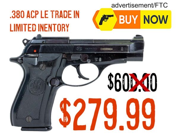 PSA with a limited selection of Police Trade-in BERETTA MODEL 84 BB 3.8″ 13 round .380ACP Pistols in excellent condition $279.99 each while supplies last. That is 50% off and you save $300.00 on this tried and true personal defense weapon.