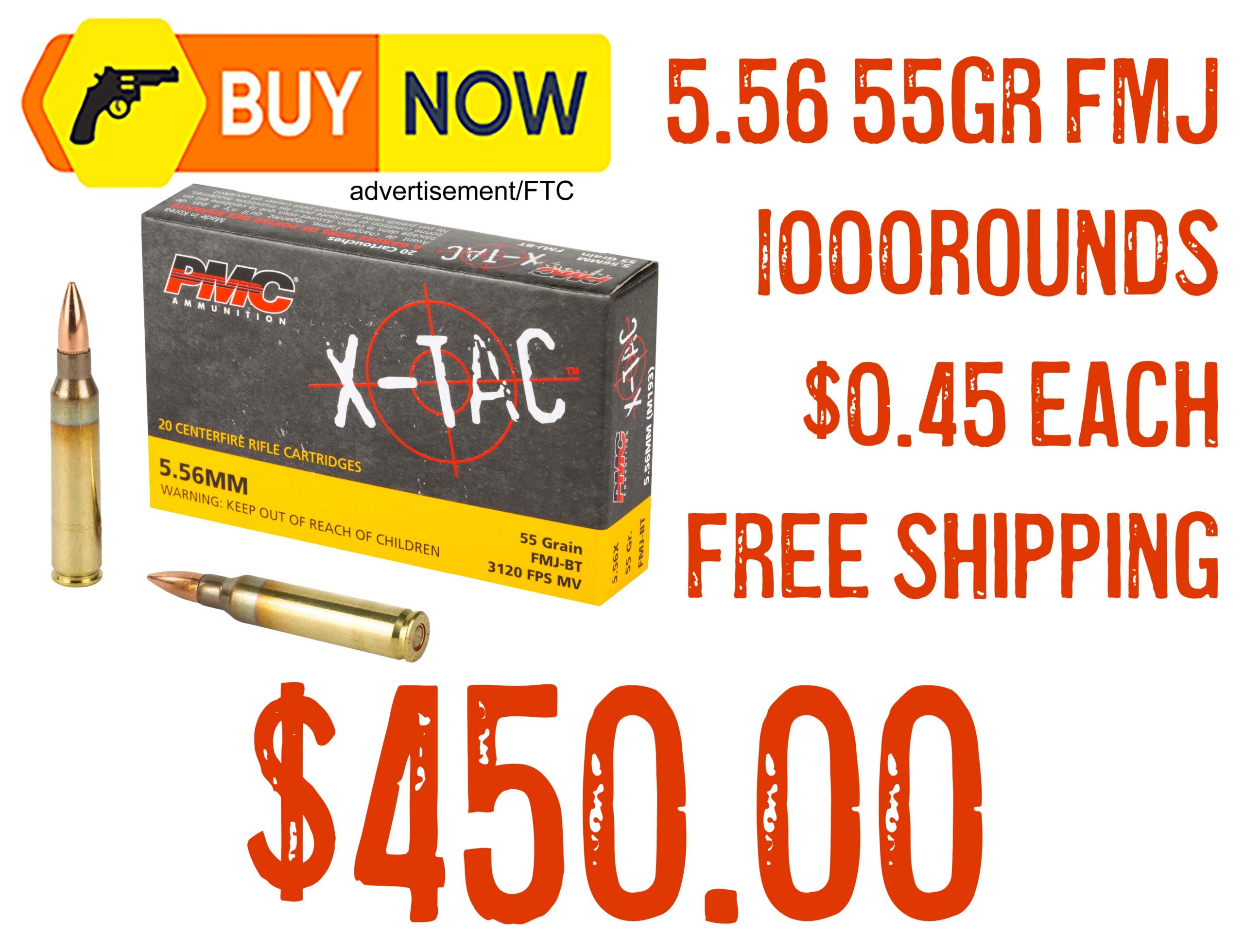 Bereli has cases of 1,000 rounds of PMC X-TAC 5.56x45mm NATO 55gr FMJ for $450 with free shipping! That is $0.45 per round.