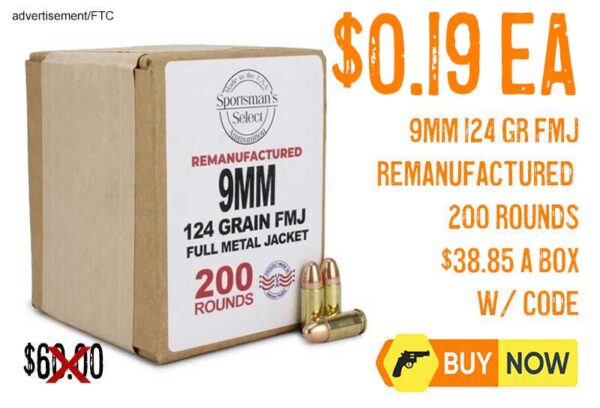 Ammunition Depot has 200 rounds of Sportsman’s Select Remanufactured 9mm 124 Gr FMJ Ammunition marked down to $38.85—that is $0.19 each a round after coupon code “ALand5” at checkout.