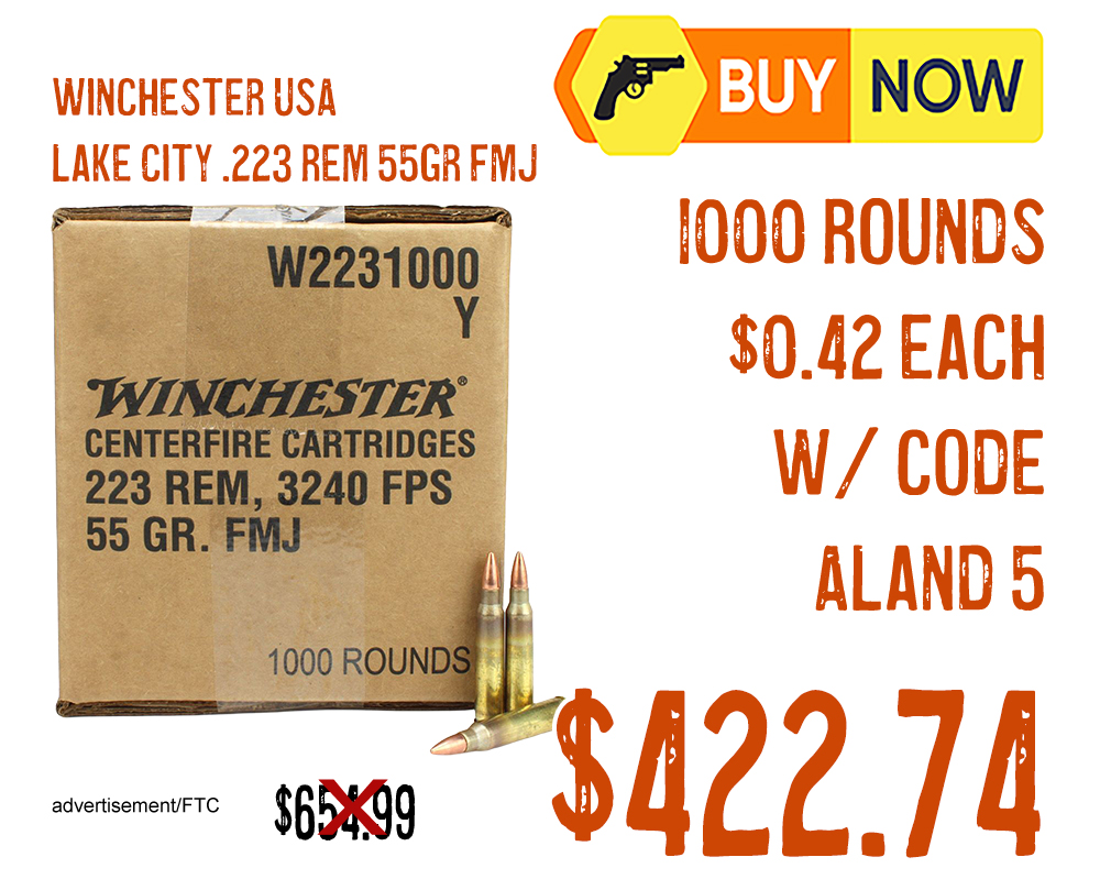 Ammunition Depot has cases of 1,000 rounds of Winchester USA Lake City .223 Rem 55gr FMJ marked down to $422.74 when you use code ALand5 at checkout. That is $0.42 per round! Stock up on .223 ammo at a serious discount. This 1,000-round bulk pack of Winchester USA White Box is perfect for training, drills, and high-volume AR-15 shooting—and it won’t last long at this price.