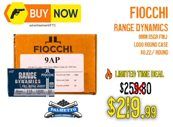 Palmetto State Armory has the Fiocchi Range Dynamics 9mm Luger 115 Grain Full Metal Jacket ammunition, 1000 rounds, marked down to $0.22 each—that is $219.99 a case!