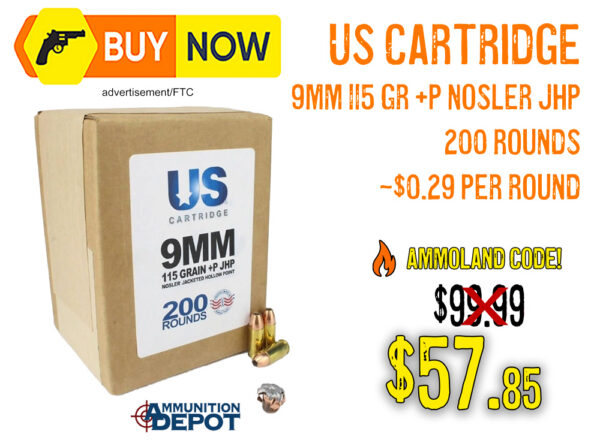Ammunition Depot has 200 rounds of US Cartridge 9mm 115 gr +P Nosler JHP marked down to $57.85 when you use code ALand5 at checkout. That is 42% off premium defensive ammo. Limited-time deal.