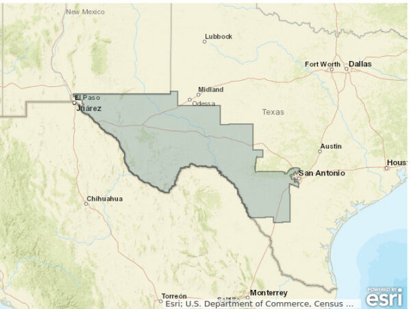 Texas District 23 covers a large chunk of west Texas. It is one of the largest congressional districts in the United States. It is a mostly rural district, running up to the edge of El Paso in the west, Odessa in the east, and San Antonio in the southeast.